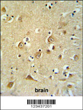 CDH20 Antibody (N-term) (Cat. APR15398G) IHC analysis in formalin fixed and paraffin embedded brain tissue followed by peroxidase conjugation of the secondary antibody and DAB staining. This data demonstrates the use of the CDH20 Antibody (N-term) for immunohistochemistry. Clinical relevance has not been evaluated. |