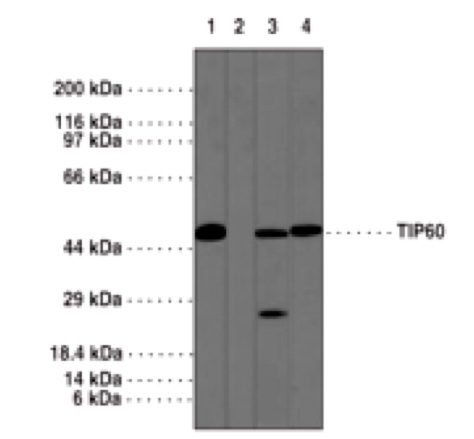 TIP60, originally isolated as an HIV-1 TAT-interactive protein, is known to interact with the viral TAT protein that leads to HTATIP polyubiquitination and targets it for degradation. It belongs to the MYST family of histone acetyltransferases (HATs). TIP60 is a catalytic subunit of the NuA4 HAT complex which is involved in transcriptional activation of select genes principally by acetylation of nucleosomal histones H4 and H2A. A co-regulator of transcription factors, TIP60 either promotes or suppresses tumorigenesis. TIP60 is an enzyme that has a role in DNA repair and apoptosis and is tho μght to play an important role in signal transduction.