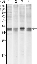 Figure 1: Western blot analysis using MCL1 mouse mAb against Hela (1), BCBL-1 (2), Jurkat (3) and HL60 (4) cell lysate.