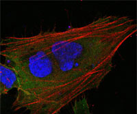 Figure 3: Confocal immunofluorescence analysis of HepG2 cells using MCL1 mouse mAb (green). Red: Actin filaments have been labeled with DY-554 phalloidin. Blue: DRAQ5 fluorescent DNA dye. |