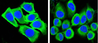 Figure 3: Confocal immunofluorescence analysis of methanol-fixed HepG2 (left) and Hela (right) cells using anti-GAPDH mAb (green), showing cytoplasmic localization. Blue: DRAQ5 fluorescent DNA dye. |