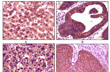 Figure 2: Immunohistochemical analysis of paraffin-embedded human liver tissue (A), colon carcinoma (B), lung carcinoma (C) and esophagus tissue (D), showing membrane localization using CK1 mouse mAb with DAB staining. |