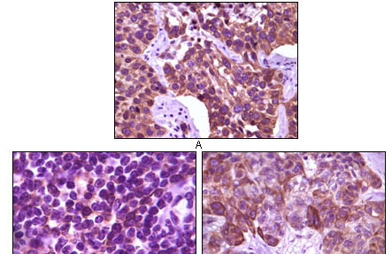 Figure 2: Immunohistochemical analysis of paraffin-embedded human lung carcinoma (A), lymph tissue (B) and skin carcinoma (C), showing membrane localization using BLK mouse mAb with DAB staining. |