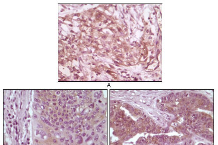 Figure 2: Immunohistochemical analysis of paraffin-embedded human pancreas carcinoma (A), esophagus carcinoma tissue (B) and ovary tumor tissue, showing cytoplasmic and membrane localization using 4E-BP1 mouse mAb with DAB staining.