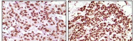 Figure 2: Immunohistochemical analysis of paraffin-embedded human infiltrating ductal carcinoma tissue(left) and simple carcinoma of breast cancer tissue(right), showing nuclear localization using PR mouse mAb with DAB staining. |