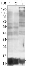 Figure 1: Western blot analysis using S100A10/P11 mouse mAb against MCF-7 (1), HepG2 (2) and Hela (3).