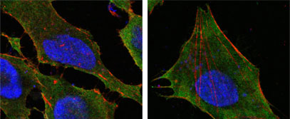 Figure 3: Confocal immunofluorescence analysis of Hela (left) and L-02 (right) cells using S100A10/P11 mouse mAb(green). Red: Actin filaments have been labeled with DY-554 phalloidin. Blue: DRAQ5 fluorescent DNA dye. |