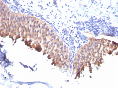 Formalin-fixed, paraffin-embedded human Bladder Carcinoma stained with Cytokeratin 10 Monoclonal Antibody (SPM261). |