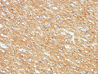 This MAb reacts with an extracellular domain (close to transmembrane) of CD56/NCAM. Three isoforms of neural cell adhesion molecule (NCAM) are produced by differential splicing of the RNA transcript from a single gene. The 135kDa isoform is the basic molecule, which is glycosylated or sialylated to produce the mature species. Anti-CD56 recognizes two proteins of the neural cell adhesion molecule, the basic molecule expressed on most neuroectodermally derived tissues and neoplasms (e.g. retinoblastoma, medulloblastomas, astrocytomas, neuroblastomas, and small cell carcinomas). It is also expressed on some mesodermally derived tumors (rhabdomyosarcoma). Anti-CD56 plays an important role in the diagnosis of nodal and nasal NK/T-cell lymphomas.