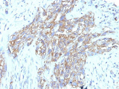 This MAb reacts with an extracellular domain (close to transmembrane) of CD56/NCAM. Three isoforms of neural cell adhesion molecule (NCAM) are produced by differential splicing of the RNA transcript from a single gene. The 135kDa isoform is the basic molecule, which is glycosylated or sialylated to produce the mature species. Anti-CD56 recognizes two proteins of the neural cell adhesion molecule, the basic molecule expressed on most neuroectodermally derived tissues and neoplasms (e.g. retinoblastoma, medulloblastomas, astrocytomas, neuroblastomas, and small cell carcinomas). It is also expressed on some mesodermally derived tumors (rhabdomyosarcoma). Anti-CD56 plays an important role in the diagnosis of nodal and nasal NK/T-cell lymphomas.