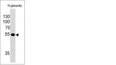 Western Blot of ODC1 in human placental Lysateusing ODC-1 Monoclonal Antibody (ODC1/485). |