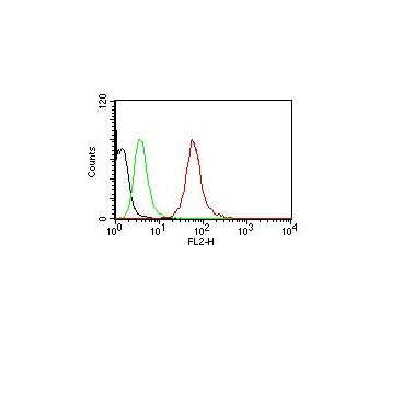 Flow Cytometry of human Pan-Cytokeratins on HeLa Cells. Black: Cells alone; Green: Isotype Control; Red: PE-labeled Pan-Cytokeratin Monoclonal Antibody (AE-1/AE-3). |