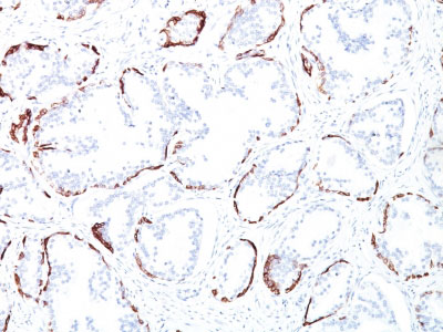This antibody recognizes CK1, CK5, CK10 and CK14. In normal epithelia, it stains stratified epithelia, myoepithelial cells and basal cells in the prostate gland and bronchi. This MAb shows no reactivity with hepatocytes, pancreatic acinar cells, proximal renal tubules, or endometrial glands; there is no reactivity with cells derived from simple epithelia. Mesenchymal tumors, lymphomas, melanomas, neural tumors, and neuroendocrine tumors are negative with this antibody. It stains myoepithelial cells and has been shown to be useful in distinguishing prostate adenocarcinoma from benign prostate. This antibody has also been useful in separating benign from malignant intraductal breast proliferations.