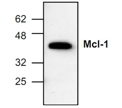 Mcl-1 (Myeloid cell leukemia-1) is a 37 kDa Bcl-2-related protein with an apparent molecular weight of 43 kDa on SDS-PAGE. Mcl-1 was identified as an early-induction gene that increased in expression during the differentiation of human myeloblastic leukemia cell ML-1, or exposure to different DNA damaging agents. The level of Mcl-1 is decreased in peripheral B lymphocytes undergoing apoptosis following treatment with apoptotic stimuli such as TGF-β1 and forskolin. Expression of Mcl-1 is able to delay apoptosis induced by over-expression of c-myc in CHO 5AHSmyc cells. In hematopoietic FDC-P1 cells, Mcl-1 interacts with another Bcl-2-related protein, Bax, and prolongs cell viability after treatment with different apoptotic reagents.