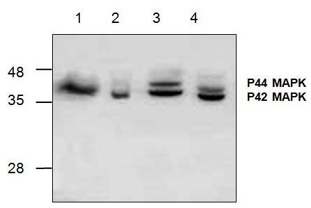 Western blot analysis of p44/42 MAPK using rat kidney tissue lysate (Lane 1), mouse 3T3 cell lysate (Lane 2) and Jurkat cell lysate (Lane 3 & 4). |