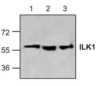 Western blot analysis of ILK1 in Jurkat cell lysate (Lane 1&2) and rat kidney tissue lysate (Lane 3). |
