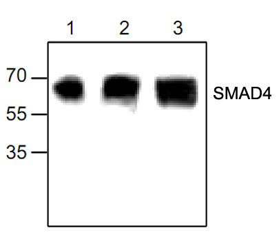 Western blot analysis of Smad4 in lysate from rat kidney (Lane 1), 3T3 cells (Lane 2) and Jurkat cells (Lane 3). |