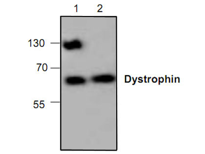 Western blot analysis of Dystrophin expression in 3T3 cell lysate (Lane 1) and rat kidney tissue lysate (Lane 2). |