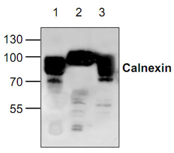 Western blot analysis of Calnexin expression in lysates from rat kidney (Lane 1), 3T3 cells (Lane 2), and Jurkat cells (Lane 3). |