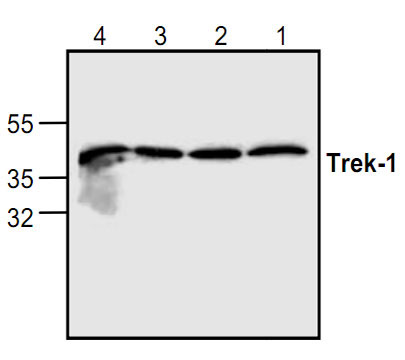 Western blot analysis of Trek-1 in Jurkat cell lysates (Lane 1, 2), 3T3 cell lysate (Lane 3), and rat kidney tissue lysate (Lane 4). |