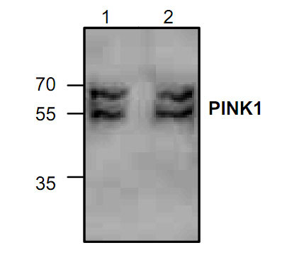 Western blot analysis of PINK1 expression in Jurkat cell lysate (Lane 1 & 2). |