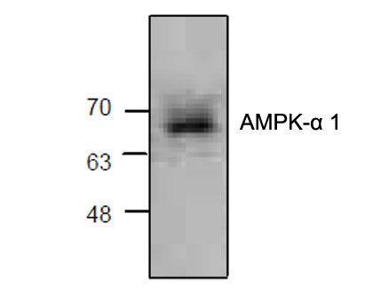 Western blot analysis of anti-AMPK alpha 1 C-term pAb in mouse liver lysate. AMPK alpha 1 (arrow) was detected using purified pAb. Secondary HRP-anti-rabbit was used for signal visualization with chemiluminescence. |