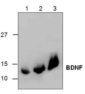 Western blot analysis of BDNF using recombinant human BDNF. Lane 1: 20 ng; Lane 2: 50 ng; Lane 3:100 ng |