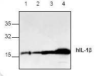 Western blot analysis with recombinant human IL-1. Lane 1: 10 ng; Lane 2: 50 ng; Lane 3: 250 ng; Lane 4: 1μg. |