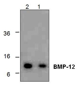 Western blot analysis of BMP-12 using recombinant human BMP-12. Lane 1: 50 ng;Lane 2: 100 ng |
