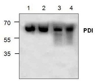 Western blot analysis of PDI in lysate from Jurkat cells (Lane 1 & 2), 3T3 cells (Lane 3) and Rat kidney (Lane 4). |