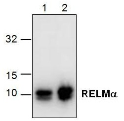 Western blot analysis of RELM-α?expression using recombinant murine RELM. Lane 1: 250 ng; Lane 2: 1μg |