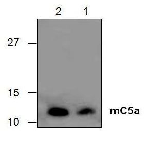 Western blot analysis of mC5a using recombinant mouse C5a. Lane 1: 20 ng; Lane 2: 50 ng |
