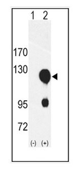 Western blot analysis of ROR2 (arrow) using ROR2 Antibody (N-term). 293 cell lysates (2 μg/lane) either nontransfected (Lane 1) or transiently transfected with the ROR2 gene (Lane 2) were loaded