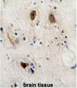 Formalin-fixed and paraffin-embedded human brain tissue reacted with ROR2 antibody, which was peroxidase-conjugated to the secondary antibody, followed by DAB staining. This data demonstrates the use of this antibody for immunohistochemistry; clinical relevance has not been evaluated. |