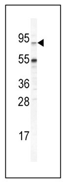 Western blot analysis of ABCG1 Antibody (Center) in 293 cell line lysates (35 μg/lane). ABCG1 (arrow) was detected using the purified pAb.