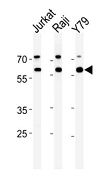 ACHE Antibody (N-term) western blot analysis in Jurkat, Raji, Y79 cell line lysates (35 μg/lane).This demonstrates the ACHE antibody detected the ACHE protein (arrow).