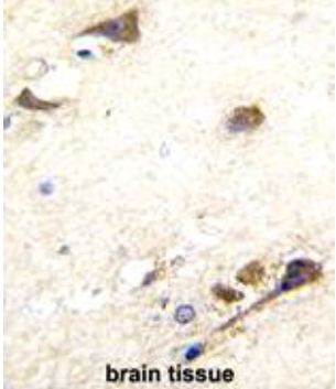 Formalin-fixed and paraffin-embedded human brain tissue reacted with ACHE antibody (N-term), which was peroxidase-conjugated to the secondary antibody, followed by DAB staining. This data demonstrates the use of this antibody for immunohistochemistry; clinical relevance has not been evaluated.