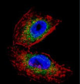 Confocal immunofluorescent analysis of ACHE Antibody (N-term) with NCI-H460 cell followed by Alexa Fluor 488-conjugated goat anti-rabbit lgG (green).Actin filaments have been labeled with Alexa Fluor 555 phalloidin (red).DAPI was used to stain the cell nuclear (blue). |