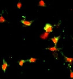 IF analysis of with HeLa cells followed by FITC-conjugated goat anti-rabbit lgG (whole molecule). FITC emits green fluorescence. Red counterstaining is PI.