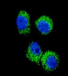 Confocal IF analysis on HeLa cells followed by Alexa Fluor 488-conjugated goat anti-rabbit lgG (green). DAPI was used to stain the cell nuclear (blue).