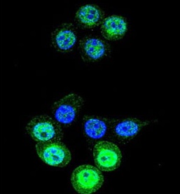 Confocal immunofluorescent analysis of AKR1B1 Antibody with 293 cell followed by Alexa Fluor 488-conjugated goat anti-rabbit lgG (green).DAPI was used to stain the cell nuclear (blue).