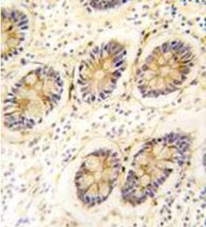 Formalin-fixed and paraffin-embedded human colon carcinoma tissue reacted with AKR1B1 antibody, which was peroxidase-conjugated to the secondary antibody, followed by DAB staining.