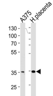 AKR1B1 Antibody western blot analysis in A375 cell line and human placenta tissue lysates (35 μg/lane). |