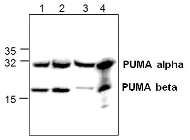 PUMA (p53 upregulated modulator of apoptosis) is one of the pro-apoptotic Bcl-2 family members which are also transcriptional targets of p53. PUMA gene encodes two BH3 domain-containing proteins termed PUMA-α and PUMA-β. PUMA proteins bind Bcl-2, localize to the mitochondria, and induce cytochrome c release and apoptosis in response to p53. PUMA may be a direct mediator of p53-induced apoptosis.