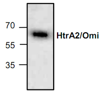Human HtrA2 (also designated Omi) is a novel member of the HtrA serine protease family and is highly homologous to HtrA (also known as L56 and HtrA1). HtrA2 is ubiquitously expressed nuclear protease that is capable of autoproteolysis. The HtrA2 protein exists as two polypeptides of 38 and 40 kDa and as an alternatively spliced form called D-Omi, which is predominately expressed in the kidney, colon and thyroid. Like HtrA, HtrA2 is involved in the degradation aberrantly folded proteins during conditions of cellular stress, s μggesting that it may possess a chaperone-like role under normal conditions.