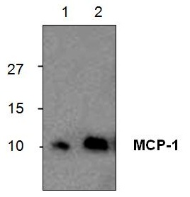 Western blot analysis of MCP-1 using recombinat human MCP-1. Lane1: 50ng; Lane2: 250ng. |