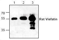 Western blot analysis using recombinat rat Visfatin. Lane1: 50ng; Lane2: 250ng; Lane3: 1ug. |