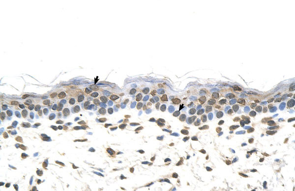 Rabbit Anti-FTCD Antibody Paraffin Embedded Tissue: Human Skin Cellular Data: Squamous epithelial cells Antibody Concentration: 4.0-8.0 μg/ml Magnification: 400X