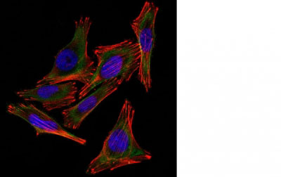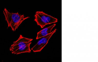 Confocal Immunofluorescent analysis of A2058 cellsusing AF488-labeled Isotype Control Monoclonal Antibody (IgG2a) (Green).F-actin filaments were labeled with DyLight 554 Phalloidin (red).DAPI was used to stain the cell nuclei (blue). (Negative Control) |