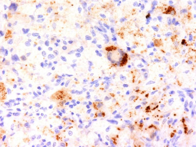 Formalin-fixed, paraffin-embedded human Erdheim Chester disease (also known as polyostotic sclerosing histiocytosis) stained with TNF alpha Monoclonal Antibody (TNF706).